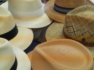 The six straw hats in this photo represent six different types of straw used for making straw hats. Starting in the bottom left corner and working clockwise are shantung straw, panama straw, sisol straw, baku straw, sea grass and milan straw.