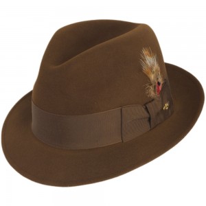 Also available is a nice quality but less expensive Dynafelt Pinch in the color “wood” or brown. Whereas the Dobbs Jet was made from fur felt, the Pinch fedora is made from a blend of wool. However, it shares many of the same features of Arkin’s hat. It has a short brim, wide hat band and brim that can be worn up or down.