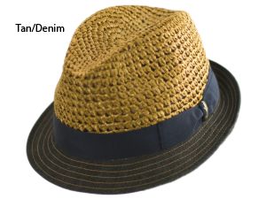 Colors: Tan/Denim. Brim: 1 1/2-inch snap brim Crown: 3 1/2-inch center dent Sizes: 6 7/8 - 7 3/4.