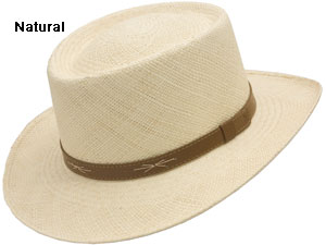 Colors: Natural. Brim: 2 3/4-inch. Crown: 4-inch gambler crown. Sizes: Sm, Med, Lg, XL.
