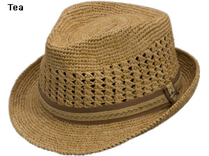 Colors: Tea. Brim: 2-inch preformed. Crown: 4-inch teardrop. Sizes: S/M, L/XL.