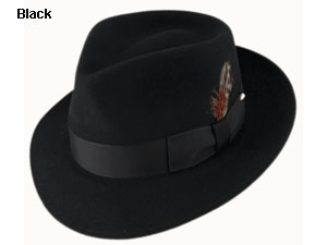 The classic Dynafelt Bogart is a stylin’ teardrop crown fedora made of a perfect blend of wool and fur felt. Great for any occasion, the Bogart sports a grosgrain dress band and optional feather for an extra dose of flair. It has a comfortable leather sweat band and satin lining. USA.
