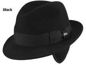 Colors: Black. Brim: 2-inch snap. Crown: 4-inch center dent. Sizes: Med
